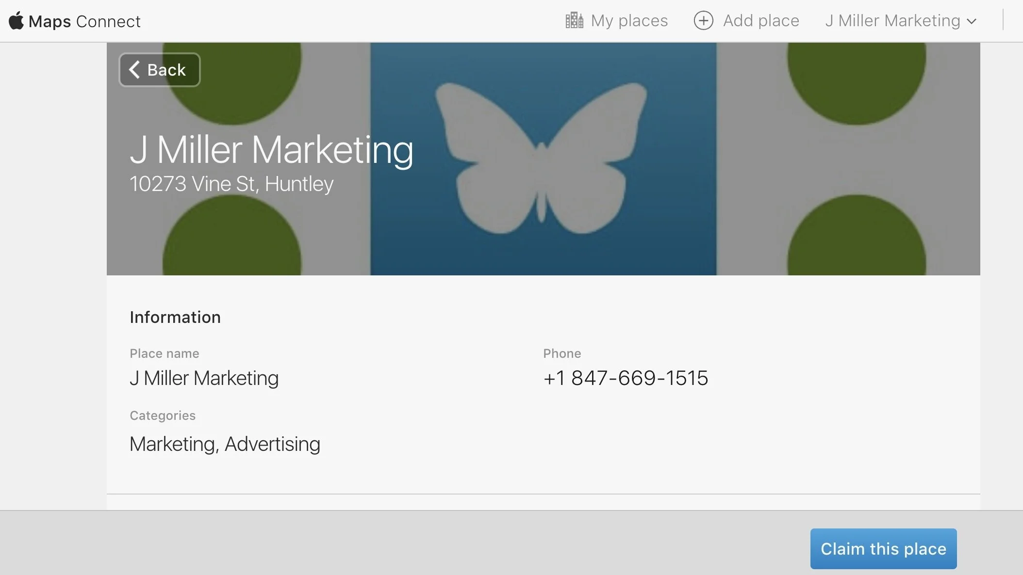 Review the listing and select ‘Claim this Place’ to begin the verification process.